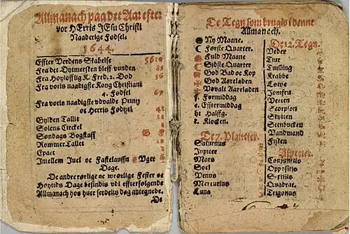 Einband des Almanachs für das Jahr 1644, des ersten in Norwegen gedruckten Buchs