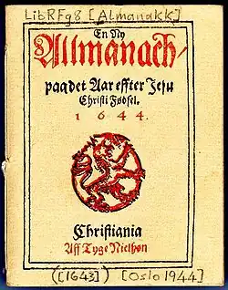• En Ny Allmanach paa det Aar effter Jesu Christi Fødsel, 1644, Christiania 1643 (Digitalisat des Exemplars der norwegischen Nationalbibliothek).