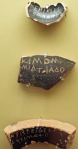 Nach dem Ende der Peisistratidenherrschaft wurde in Athen das Scherbengericht eingeführt und 488/487 v. Chr. erstmals angewendet. Es beruhte auf der gesetzlichen Vorschrift, dass die Volksversammlung alljährlich darüber zu entscheiden hatte, ob unter den Bürgern einer war, dem die Absicht zuzutrauen war, sich zum Tyrannen aufzuschwingen. Gegebenenfalls wurde dieser Bürger dann für zehn Jahre verbannt. Abgestimmt wurde mit Tonscherben; jeder Abstimmungsteilnehmer schrieb den Namen des Mannes, den er verdächtigte, auf eine Scherbe. Verbannt wurde dann die Person mit der höchsten Stimmenzahl, falls das Quorum von 6000 Stimmen erreicht wurde. Da man dem Verdächtigten nichts nachweisen konnte und ihn nur aufgrund eines Verdachts verbannte, handelte es sich nicht um eine Bestrafung, sondern um eine Vorsichtsmaßnahme. Konkrete Schritte zur Errichtung einer Tyrannis hingegen galten als Straftat. Eine darauf lautende Anklage wurde tyrannídos graphḗ („Schriftklage wegen Tyrannis“) genannt. Wenn ein Angeklagter für schuldig befunden wurde, verfiel nicht nur er selbst, sondern auch seine Nachkommenschaft der Atimie, das heißt, ihnen wurde der Schutz durch die Gesetze entzogen, jeder durfte sie straflos töten. Später wurde die Abwehr zu einer allgemeinen Pflicht erhoben: Nach einem Volksbeschluss von 410 v. Chr. musste sich jeder Bürger eidlich verpflichten, bei sich bietender Gelegenheit jeden zu töten, der sich zum Tyrannen aufschwang oder zu einem solchen Vorhaben Beihilfe leistete, und ebenso jeden, der unter einem Tyrannen ein Amt bekleidete. Man nennt diesen Schwur nach dem Urheber des Volksbeschlusses den „Eid des Demophantos“. Jede Volksversammlung wurde mit einer Verfluchung potentieller Tyrannen begonnen.[83] Ein weiteres Gesetz zur Tyrannisprävention, das „Eukrates-Gesetz“, führten die Athener 336 v. Chr. ein.[84]