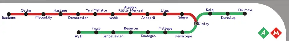 Zwischen dem zentralen Kızılay-Platz und dem nordwestlichen Stadtteil Batikent verkehrt die U-Bahn-Linie M1. Auf die 14,6 km lange Strecke verteilen sich 12 Stationen. Auf 6,5 km verläuft die Strecke im Tunnel und auf 3,2 km als Hochbahn auf einem Viadukt. Die restlichen 4,9 km verlaufen im Einschnitt. Auch der oberirdische Teil der Strecke verläuft unabhängig vom Straßenverkehr.