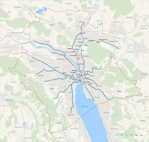 Beide Achsen der abgelehnten U-Bahn werden mittlerweile durch Stadtbahnen abgedeckt, die zwischen 2006 und 2010 in Betrieb genommene Glattalbahn und die 2022 eröffnete Limmattalbahn. Angesichts steigender Einwohnerzahlen und zunehmender Verkehrsdichte gab es im frühen 21. Jahrhundert dennoch wiederholt Vorschläge für tunnelgeführte Schienenverkehrsnetze. 2003 präsentierte der Informatiker Thomas Mouzinho im Rahmen des Ideenwettbewerbs «Zürich Nachhaltig» das Konzept einer Ring-U-Bahn. Der «Zürkel» sollte von Wollishofen über Albisrieden, Altstetten, Höngg, Affoltern, Oerlikon, Glattzentrum, Stettbach, Witikon und Tiefenbrunnen zurück nach Wollishofen führen.[44][45] 2011 griff Ulrich Weidmann, Professor für Verkehrssysteme an der ETH Zürich, erneut die Idee einer unterirdischen Strassenbahn in der Innenstadt auf, ähnlich dem Tiefbahnprojekt von 1962. Seiner Meinung nach sei die S-Bahn überlastet und die Strassenbahn zu langsam. Die durch den Rückbau der Gleise freiwerdende Fläche sollte – im Gegensatz zu den Ansichten von Verkehrsplanern früherer Jahrzehnte – nicht dem Automobilverkehr zugutekommen, sondern der allgemeinen Steigerung der Lebensqualität.[46] Basierend auf dieser Idee, erstellte zwei Jahre später die von Weidmann betreute Studentin Christine Furter in ihrer von der Vereinigung LITRA ausgezeichneten Masterarbeit das detaillierte «Metrotram»-Konzept. Es sieht Tunnelstrecken von 10,3 km Länge und 18 Stationen vor. Trotz der veranschlagten Kosten von 2,3 bis 2,75 Milliarden Franken schnitt diese Variante punkto Wirtschaftlichkeit deutlich besser ab als ein ebenfalls untersuchtes U-Bahn-Netz.[47] Im Dezember 2015 reichten zwei grünliberale Kantonsräte ein Postulat ein, das den Regierungsrat dazu aufforderte, einen Bericht über eine mögliche U-Bahn für den Grossraum Zürich zu erstellen. Konkrete Linienführungen nannten die Postulanten nicht, doch sollte der Hauptbahnhof aus Kapazitätsgründen nicht erschlossen werden.[48] In seiner Antwort vom März 2016 befand der Regierungsrat, dass eine U-Bahn in der Stadt und der Agglomeration Zürich «weder erforderlich noch sinnvoll» wäre. Zudem entstünden unnötig hohe Kosten.[49]