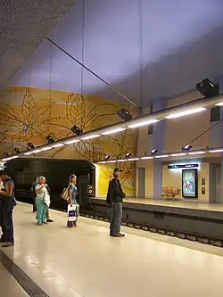Für die Ausgestaltung des Bahnhofes fand sich die Malerin Graça Morais. Sie sah es als Aufgabe mögliche Klaustrophobien der Fahrgäste zu nehmen und eine starke Assoziation mit der oberirdischen Welt herzustellen. Dafür verwandte sie die Farben hellblau (für den Himmel) und braun-gelb (für die Erde). Jeweils am östlichsten und westlichsten Ende der Halle befinden sich über den Tunnelmündern große Naturgemälde, die durch Strichzeichnungen von Ahornblättern dominiert werden.[2]