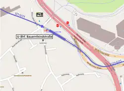 Nordwestlich des Geländeeinschnitts, in dem sich heute der U-Bahnhof befindet, auf der anderen Seite der Bauernfeindstraße, lag von 1964 bis 1970 die Wendeschleife der Straßenbahn; dort befindet sich heute ein P&R-Parkplatz. Dort war bereits ein Gleis zur nie realisierten Weiterführung der Straßenbahn nach Langwasser angelegt worden. Da zwei Brückenbauwerke südlich des U-Bahnhofes bereits fertiggestellt wurden, als noch eine Straßenbahn nach Langwasser geplant war, befindet sich zwischen den Bahnhöfen Messe und Bauernfeindstraße eine sehr enge Kurve, die noch nach Straßenbahnparametern angelegt ist. Langfristig ist es geplant diese Strecke durch eine geradlinige Trassierung zu ersetzen.