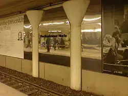Die Wände sind mit 15 Fotos der Fotografin Barbara Klemm aus dem Universitätsalltag Mitte der 1980er Jahre geschmückt, die Zwischenräume sind mit verspiegelten Metallplatten verkleidet, die den Raum größer erscheinen lassen. Die in Gruppen auf dem Bahnsteig platzierten Säulen sind weiß gestrichen und mit goldfarbenen Metallprofilen versehen, die sich auch in anderen Bereichen des Stationsbauwerks wiederfinden.