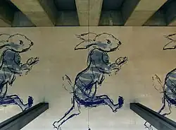 Den Entwurf für den neuen U-Bahnhof, der sich direkt unter den Gleisen der Linha de Cascais befindet, übernahm der Architekt Nuno Teotónio Pereira. Er entwarf eine sehr breite und hohe Bahnsteighalle; ein langer Gang mit Laufbändern ausgestattet befindet sich direkt über den Gleisen. Typisch für Lissabonner U-Bahnendstationen erhielt der U-Bahnhof drei Bahnsteiggleise an einem Mittelbahnsteig und einem Seitenbahnsteig. Für die künstlerische Ausgestaltung des Bahnhofes wählte die Betreibergesellschaft den Maler Pedro Morais aus, der einige Zeichnungen des Surrealisten António Dacosta auf großen Fliesenpaneelen parallel zu den Bahnsteiggleisen anbrachte. Sie zeigen 24 überdimensionale Hasen mit einer Uhr in der Pfote, sie sollen an den Hasen im Märchen Alice im Wunderland von Lewis Carroll erinnern.[2] Unter den zahlreichen Hasen steht in Majuskeln der Satz „Estou atrasado“, zu Deutsch „Ich bin zu spät“.