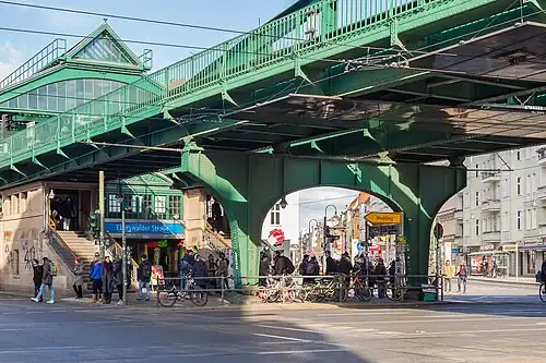 Rund 80 Meter südlich befindet sich unter dem Viadukt der Hochbahn seit 1960 Konnopkes Imbissbude.