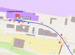 Der U-Bahnhof Flughafen (Abkürzung: FL) wurde als 39. U-Bahnhof der Nürnberger U-Bahn am 27. November 1999 eröffnet, womit Nürnberg seit Schließung des Flughafens Tempelhof in Berlin im Jahr 2008 die einzige Stadt in Deutschland ist, deren Flughafen mit der U-Bahn zu erreichen ist.[2] Er ist 2388 m vom U-Bahnhof Ziegelstein entfernt und Endbahnhof der Linie U2. Der Abstand zwischen den U-Bahnhöfen Ziegelstein und Flughafen ist der größte im Nürnberger U-Bahn-Netz.