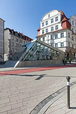 - ↑ a b Michael Stößlein: Entwurfserläuterung. (PDF) Raumbildender Ausbau des U-Bahnhof Friedrich-Ebert-Platz. In: Informationen aus Stadtrat und Ausschüssen. 21. September 2005, S. 2–3, abgerufen am 30. September 2011 (Beilage 5.1 zum Tagesordnungspunkt 5 der Sitzung des Bau- und Vergabeausschusses vom 18. Oktober 2005): „Aufgang A1 vor dem Denkmal geschützten Gebäude […]“