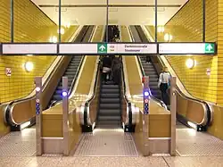 An beiden Enden der Röhren befinden sich Rolltreppen, die jeweils in Zwischengeschosse in ein- bzw. zweifacher Tieflage führen. Von diesen aus ist über weitere Verbindungen die Oberfläche erreichbar. Auf der östlichen Seite befindet sich ein Aufzug.
