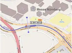 Der Bahnhof liegt im Nürnberger Stadtteil Neuselsbrunn oberirdisch inmitten der Otto-Bärnreuther-Straße. Beide Aufgänge führen zu einem Fußgängersteg, der vom Eingang der Messe bis nach Neuselsbrunn führt. Der Aufzug führt vom Bahnsteig ebenfalls zum Fußgängersteg.