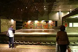 Der Portugiese Joaquim Rodrigo, der während der finalen Arbeit verstarb, entwarf das 2,70 × 12,5 Meter große Fliesengemälde „Praia do Vau“, das einen bekannten Strand in der portugiesischen Algarve darstellt. Rodrigo hinterließ dem portugiesischen Künstler Querubim Lapa konkrete Anweisungen, wie das Werk zu vollenden sei. Der Österreicher Friedensreich Hundertwasser wählte ebenso die Fliesen für sein Werk, er entwarf ein Gemälde mit dem Namen Unterwassersetzung von Atlantis.[3] Yayoi Kusama aus Japan entwarf ein namenloses Fliesengemälde, das sich an der nördlichsten Bahnsteigwand – nur unterbrochen durch den Tunnelmund zur Kehranlage – befindet. S. H. Raza aus Indien verwandte ebenfalls die traditionelle Fliesenkunst, um ebenfalls mit dem Gemälde „Les Océans“ auf das Motto der Weltausstellung einzugehen.