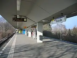 Der U-Bahnhof liegt auf einem Erddamm unmittelbar südöstlich der Brücke über die Otisstraße. Er befindet sich 7,35 Meter über dem Straßenniveau und verfügt über einen 8,30 Meter breiten, vollständig überdachten Mittelbahnsteig.[1] Der Zugang erfolgt am nördlichen Bahnsteigende über eine feste Treppe von einer unter dem Gleiskörper gelegenen Zugangshalle.[2] Die Gestaltung der Station ist zweckmäßig; die Aufbauten bestehen aus blauen Stahlrahmen, die Mauerwerksausfachungen sind mit gelbem Kleinmosaik verkleidet. Der für die kalte Jahreszeit angelegte verglaste Wartesaal auf dem Bahnsteig ist nicht mehr öffentlich zugänglich.[1]