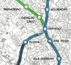 Mit dem Bau der Linha 1–Azul in den 1970er Jahren wurden bereits räumliche Vorkehrungen für die spätere Einbindung der Linha 2–Verde getroffen. Auch rund 500 m Tunnel in Richtung Avenida Paulista wurden bereits vorab gebaut. Städtebaulich entstand durch den Bau der Metro und der Schnellstraße Avenida 23 de Maio ein schwierig nutzbares Restgelände entlang eines langgestreckten Hangs. Ein innovatives Urbanisierungsmodell der Stadtplanungsgesellschaft EMURB, das eine gemischte Nutzung durch öffentliche und private Akteure vorsah, wurde später verworfen. Stattdessen wurde im südlichen Abschnitt das heutige Centro Cultural São Paulo errichtet.[1][2]