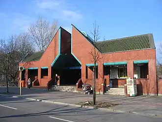 Der Mittelbahnsteig des Bahnhofs hat Ausgänge an beiden Bahnsteigenden, die jeweils in Vorhallen führen. Der südliche Ausgang ist eine Besonderheit: Er verfügt über eine oberirdische Vorhalle, die sich brückenartig über dem Nordgraben befindet. Rote Klinker zieren die Wände in der Bahnsteighalle, Natursteinblöcke lockern sie auf. Die Mittelstützen sind rot, weiß und schwarz sowie im Kapitell gelb. Wie auch die anderen 1994 eröffneten Bahnhöfe der Linie U8 wurde diese Station nach einem Entwurf von Rainer G. Rümmler errichtet.