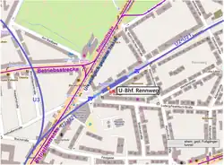Der Bahnhof liegt im Nürnberger Stadtteil Rennweg und erstreckt sich in Nord-Süd-Richtung unterirdisch unter dem Rennweg zwischen Martin-Richter- und Ludwig-Feuerbach-Straße. Von beiden Bahnsteigköpfen führen Aufgänge an die Oberfläche. Ein Aufzug führt vom südlichen Bahnsteigbereich zur Straßenebene. In direkter Umgebung befindet sich der Nürnberger Stadtpark.
