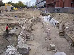 Der Baubeginn verzögerte sich, da Archäologen bei Grabungen vor dem Roten Rathaus unerwartet gut erhaltene Reste des mittelalterlichen Berliner Rathauses fanden. In der Folge wurde der Bahnhof umgeplant und ein Ausgang verlegt, sodass nun Teile dieser Relikte erhalten bleiben und gegebenenfalls durch ein archäologisches Fenster präsentiert werden können.[7][8]