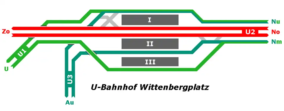 Die Gleisverbindungen erlauben verschiedenste Linienführungen, nur die Verbindung von Uhlandstraße nach Nollendorfplatz (oben) ist nicht möglich (siehe Gleisplan). Die bestehenden Streckenführungen haben den Vorteil, dass Züge der U2 und der U1/U3 gleichzeitig ausfahren können, ohne eine Flankenfahrt zu verursachen.