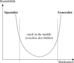 eine signifikant hohe Rentabilität aufweisen. Andere Wettbewerber – mit mittelmäßigen Marktanteilen – erreichen hingegen geringe Rentabilität. Die Wettbewerber mit mittelmäßigen Marktanteilen „sitzen zwischen den Stühlen“ (Stuck in the Middle): Sie sind zu klein, um mit den Marktführern zu konkurrieren, und zu groß, um die Nischeneconomies der Spezialisten nutzen zu können. Die Größenangaben für hohe Rentabilitäten in Bezug auf den Marktanteil variieren bei empirischen Befunden. So wird die Spanne für ein stuck in the middle mit zehn bis 20 Prozent Marktanteil in mehreren Studien genannt, während sich die Spannbreite für Spezialisten in der Größenordnung von ein bis fünf Prozent (alle Spezialisten zusammen jedoch nicht mehr als zehn Prozent) bewegt und für Unternehmen mit mehr als 40 Prozent Marktanteil wiederum steigende Rentabilitäten beobachtet werden.