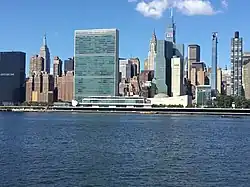 | Blick vom Gantry Plaza State Park, Queens auf das UN-Hauptquartier, dahinter von links: Empire State Building, Chrysler Building, One Vanderbilt und MetLife Building | |