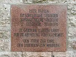 „Hier ruhen 67 sowjetische Soldaten, 32 französische Soldaten, 2 belgische Soldaten. Sie gaben ihr Leben im Kampf für die Befreiung vom Faschismus. Den Toten zur Ehre, den Lebenden zur Mahnung.“