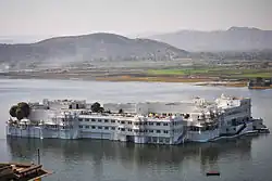 - Der Lake Palace wurde in den Jahren 1743–1746 für Maharana Jagat Singh II., dem 62. Maharadscha von Mewar, als Sommerresidenz errichtet. Er ist nach Osten ausgerichtet, damit in der Morgendämmerung der hinduistische Sonnengott Surya angebetet werden kann. Der eine Insel bildende Palast gehört, wie die meisten übrigen Paläste, noch heute der ehemaligen Herrscherfamilie und wird als Luxushotel von der Taj-Gruppe betrieben; er ist nur für Hotelgäste zugänglich. Weltberühmt wurde er als Kulisse für zahlreiche Filme, darunter Der Tiger von Eschnapur (1959) oder James Bond 007 – Octopussy (1983).