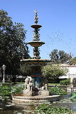 Im Garten befinden sich in vier Wasserbecken zahlreiche Springbrunnen, die aus einem Reservoir gespeist werden, welches zusammen mit den Springbrunnen aus England importiert worden ist. Dies führt auch dazu, dass auf sparsamen Wasserverbrauch geachtet wird und zu Zeiten die Springbrunnen nur gegen einen Obolus geöffnet werden. Bemerkenswert sind auch Elefanten aus Marmor, sowie vier Kioske, welche von wasserspeienden Vögeln gekrönt sind, wodurch die Illusion fallenden Regens erzeugt werden soll, die vom späteren Maharana Bhopal Singh errichtet wurden.