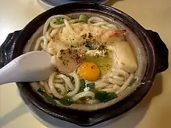 - Nabe-yaki Udon (鍋焼きうどん): Eintopfgericht mit Pilzen, Gemüse, Ei, Fleisch, Udon und gelegentlich auch Shrimp-Tempura. Das Gericht wird in einem Steintopf zubereitet und serviert, es wird vor allem im Winter gegessen.[5][18]