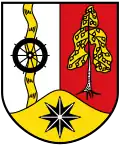 Blasonierung:„Gespalten in Silber (Weiß) und Rot über einem goldenen (gelben) Hügel, darin schwebend ein achtzackiger schwarzer Stern; vorn ein goldener (gelber) Wellenpfahl belegt mit einem zehnspeichigen schwarzen Mühlrad und hinten eine goldene (gelbe) bewurzelte Birke mit silbernem (weißem) Stamm.“