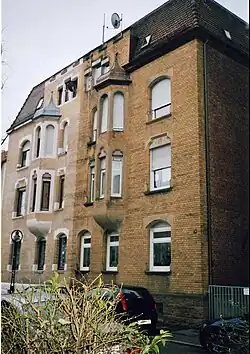 Das Doppelhaus wurde im Jahre 1902 für Karl Geiger, Eugen Walz und August Stadler nach Plänen von August Dederer im Stil des Späthistorismus in seiner neugotischen Variante errichtet. Es besitzt Schulterbögen an den Fenstern und Erker mit Dreipassbögen und Zinnen. Über den Fenstern der Beletage befinden sich farbige Wandmalereien mit spätgotischen Motiven.