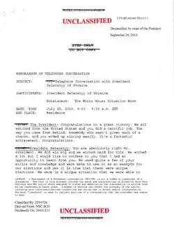 Am Mittwoch, dem 25. September 2019, veröffentlichte das Weiße Haus ein Memorandum – keine wortwörtliche Wiedergabe – des Anrufs zwischen Selenskyj und Trump, um diesen zu entlasten.[29] Außerdem wurde die Geheimhaltung der Beschwerde des Whistleblowers aufgehoben, sodass Mitglieder des Geheimdienstausschusses das Dokument einsehen konnten.[30] Tags darauf, am 26. September 2019, wurde das Dokument mit einem teils geschwärzten Anhang veröffentlicht. Der Informant beschuldigt Trump darin, die Macht seines Amtes für persönliche Zwecke missbraucht und versucht zu haben, Selenskyj dazu zu bringen, zu seinen Gunsten in die Präsidentenwahl im Jahr 2020 einzugreifen, außerdem das Weiße Haus, die Dokumentation des Gesprächs mit besonderen Maßnahmen unter Verschluss gehalten zu haben.[31] Neben Trump werden auch häufig Giuliani und Justizminister William Barr benannt.