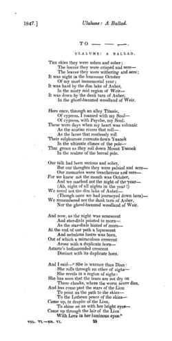 - ↑ Siehe Franz H. Link: Edgar Allan Poe · Ulalume - A Ballad. In: Klaus Lubbers (Hrsg.): Die amerikanische Lyrik - Von der Kolonialzeit bis zur Gegenwart. Bagel Verlag, Düsseldorf 1974, ISBN 3-513-02215 - 8, S. 110 f.