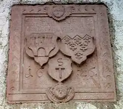 In Blau eine goldene Burg mit einem roten Tor, Eingang, zwei Fenstern und drei Zinnentürmen, der mittlere Turm ist rot bedacht. Helmzier ist auf einem golden bequasteten, roten Kissen ein goldener, mit einem Pfauenstoß besteckter Topf (Vase, Urne). Die Helmdecken sind blau-golden.[11]
