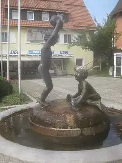 - 1953/1955: Oberlenningen, Marktplatz, Marktplatzbrunnen, Bronze und Muschelkalk, lebensgroß.
