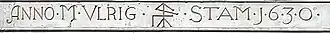 Vor- und Nachname Ulrich Stamms („VLRIG STAM“), sein Steinmetzzeichen und Jahreszahl („1630“) der Entstehung.