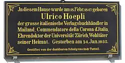 Geburtshaus Johann Ulrich Hoeplis in UntertuttwilGedenktschild am Geburtshaus Ulrico Hoeplis