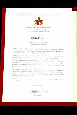 - 2012 wurde Ulrike Enders „… für 40 Jahre Verdienste um die Kunst- und Kulturstadt Hannover“[11] mit der Stadtplakette Hannover ausgezeichnet.[12]
