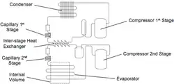 Im Betrieb wird die Wärmeaustauschspule gekühlt, wenn der Kompressor der ersten Stufe (Hochtemperatur) startet. Wenn dann ein Kompressor der zweiten Ebene (niedrige Temperatur) arbeitet, kondensiert sein Kühlsystem in der Wärmetauscherspule der ersten und der zweiten Ebene. Das System reduziert die Temperatur des Kühlschranks auf unter −80 °C oder −90 °C. Wenn die Stromversorgung eingeschaltet wird, ist die Anzeigetemperatur höher als die eingestellte Temperatur. Das führt dazu, dass der Kompressor der ersten Stufe gestartet wird, um das Kühlsystem zu betreiben. Dadurch sinkt die Temperatur am Kondensator des Kühlsystems der zweiten Stufe und die Kältemitteltemperatur der zweiten Stufe. In dieser Phase beginnt das Kühlsystem der zweiten Stufe zu arbeiten.