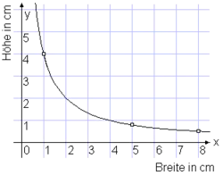Das nebenstehende Diagramm zeigt die beiden Wertepaare als markierte Punkte. An der Hyperbel kann man weitere flächengleiche Rechtecke ablesen, z. B. 1 cm breit, 4 cm hoch.