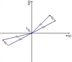 Abbildung 1 zeigt das komplexe Zeigerdiagramm einer Spannungsmessung bei eingespeistem Strom an einem Prüfling mit dem Umpolungsverfahren. Hierbei ist: