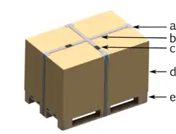 Umreifter Karton auf Europalette. (a) Kantenschutz (b) Umreifung (c) Sicherungshülse (d) Karton (e) Palette