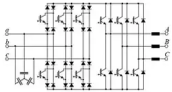 Die Matrix besteht im Dreiphasensystem, wie bei dem vereinfachten Schaltbild rechts dargestellt, aus jeweils drei Pfaden pro Phase, womit es möglich ist, jede Ausgangsphase, bezeichnet mit den Großbuchstaben A, B und C wahlweise mit einer der Eingangsphasen a, b oder c zu verbinden. Die Reihenschaltung zweier IGBTs pro Pfad ist notwendig, um sowohl positive als auch negative Halbschwingungen schalten zu können. Durch die hier der Übersichtlichkeit wegen nicht dargestellte Ansteuerschaltung werden bei diesem Umrichter bestimmte Zeitabschnitte der Eingangsspannungen so an den Ausgang geschaltet, dass sich eine geänderte Frequenz ergibt. Die dabei unstetigen Übergänge im Bereich der Umschaltzeitpunkte äußern sich in Oberschwingungen, die durch zusätzliche Oberschwingungsfilter gedämpft werden.