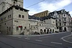 In der Oleariusstraße an der Ostseite des Hallmarkts entstand unterhalb der Westfassade der Marktkirche Unser Lieben Frauen ein breitgelagertes Gebäude, dessen Ecken hervorgehoben sind. Während die Fenster im Erdgeschoss rundbogig gestaltet wurden, wählte man im Obergeschoss schlichtere quadratische und rechteckige Fenster. An der Platzseite ist dem Bau eine Freitreppe vorgelagert, die mit einer eigenen Rundbogenfassade versehen wurde und so das wehrhafte Aussehen unterstreicht. Sie bildete aber auch einen neuen Aufgang zur Kirche. Zu den Besonderheiten des Standorts zählt die Notwendigkeit der Überwindung des Höhenunterschieds zwischen den beiden Marktplätzen nahe der Halleschen Marktplatzverwerfung, einer tektonischen Besonderheit, die die Stadt in zwei Teile teilt und sich auch auf die Standfestigkeit der Westfassade der Marktkirche auswirkt.[11][4]