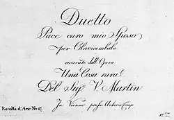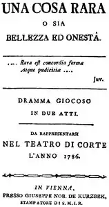 Una cosa rara o sia Bellezza ed onestà (Der seltene Fall oder Schönheit und Ehrbarkeit[9]) ist das zweite von fünf Drammi giocosi, die aus der Zusammenarbeit des Venezianers Lorenzo Da Ponte (Libretto) und des Valencianers Vicente Martín y Soler (Musik) hervorgingen[10]. Die Uraufführung fand 1786 in Wien statt. Obwohl einer der größten Bühnenerfolge seiner Zeit[11], geriet das Werk später für lange Zeit in Vergessenheit.