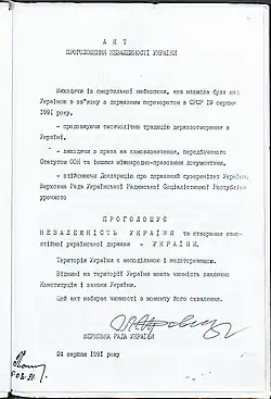 Nach dem gescheiterten Augustputsch in Moskau verabschiedete die Werchowna Rada, der ehemalige Oberste Sowjet der USSR, am 24. August 1991 die formelle Unabhängigkeitserklärung. Der Jurist und Bürgerrechtler Lewko Lukjanenko gilt als Hauptautor der Erklärung. Unterzeichner war Leonid Krawtschuk als Präsident der Werchowna Rada. Die Unabhängigkeitserklärung bezog sich mit dem Wort „Verfassung“ auf die Verfassung der Ukrainischen Sozialistischen Sowjetrepublik; sie wurde 1996 durch die Verfassung der Ukraine abgelöst.