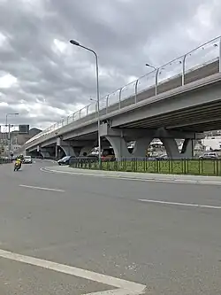 Die Ringautobahn wird mittels eines geschwungenen, 420 Meter langen Viadukts über Kreisverkehr und Fluss geführt und setzt sich nach Norden fort.[39]