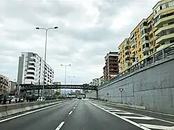 Der dicht bebaute Westen Tiranas im Stadtviertel Selita wird in einem Graben durchquert, so dass der städtische Verkehr einfacher die Autobahn auf Straßen- und Fußgängerbrücke queren kann.