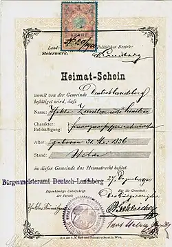 - ↑ Vgl. Weiß, Hugo; Das Heimatrecht nach der Heimatgesetznovelle vom 5. Dez. 1896 und den einschlägigen Bestimmungen des Gesetzes vom 3. Dezember 1863; Wien 1906