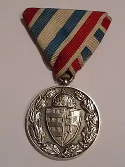 Die Auszeichnung ist eine aus Tombak gefertigte, versilberte runde Medaille mit einem Durchmesser von 31 mm und zeigt das von der Stephanskrone überragte kleine Wappenschild Ungarns. Umlaufend sind ein Eichen- (links) und ein Lorbeerzweig (rechts) mit kleinen Früchten zu sehen. Im Revers mittig die Jahreszahl 1914-1918 sowie im oberen Halbkreis die Inschrift PRO DEO ET PATRIA (Für Gott und Vaterland). Der untere Halbkreis wird von zwei zusammengebundenen Palmzweigen geziert.