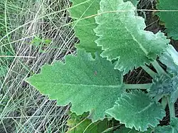 Die Laubblätter sind hauptsächlich in grundständigen Blattrosetten[6] und nur ein bis zwei Paare gegenständig am Stängel angeordnet. Der Blattstiel der Grundblätter ist mit einer Länge von 2 bis 5, selten bis zu 7 oder bis zu 10 Zentimetern relativ lang[3][2][5] und dicht wollig und drüsig behaart.[3][7] Die einfache, weiß oder grau wollig und drüsig behaarte Blattspreite ist bei einer Länge von meist 10 bis 25 (5 bis 30) Zentimetern sowie einer Breite von 2 bis 12, selten bis zu 15 Zentimetern[5][7] eiförmig bis eiförmig-länglich oder elliptisch-rhombisch, breit-lanzettlich bis dreieckig mit spitzem bis gerundetem oberen Ende.[2][3][6] Die Spreitenbasis ist herzförmig bis keilförmig und der Blattrand sehr unregelmäßig gekerbt oder grob ausgefressen gezähnt.[2] Die Blattfläche ist stark netzig-runzelig.[2][7] Die Stängelblätter sind den Grundblättern ähnlich, aber kleiner und nur kurz gestielt.[3][2][7]