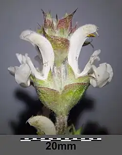 Die zwittrigen[2][4] Blüten sind bei einer Länge von 1,4 bis 2 Zentimetern[2] zygomorph und fünfzählig mit doppelter Blütenhülle. Die fünf lederigen, grün-weißlichen, manchmal rot-purpurfarbenen überlaufenen Kelchblätter sind röhrig-glockig verwachsen.[3] Der sehr dicht weiß wollig und drüsig behaarte Kelch ist 13-nervig und während der Anthese 10 bis 12 Millimeter lang und zweilippig,[3] wobei die Oberlippe länger ist als die Unterlippe.[5] Die Kelchröhre ist 13 bis 15 Millimeter lang.[5] Die Kelchoberlippe ist etwas aufwärts gebogen und endet in zwei bei einer Länge von 2 bis 5 Millimetern längeren Seitenkelchzähnen und einen etwas kürzeren[5] bis sehr kurzen[7] mittleren Kelchzahn.[3] Die Kelchunterlippe ist tief in zwei Kelchzähne geteilt,[5] die bei einer Länge von 5 bis 8 Millimetern lanzettlich mit stachelpitzigem oberen Ende sind.[3] Die fünf ungleichen, mehr oder weniger spreizenden Kelchzähne sind lanzettlich, oft violett, stechend begrannt.[3][7][6] Die fünf 10 bis 15 Millimeter langen Kronblätter sind verwachsen. Die Krone ist weißlich[2] oder weißlich-rosafarben[3] und nur auf dem Rücken kurz behaart. Die 10 bis 20 Millimeter lange, gerade[3][6] Kronröhre überragt den Blütenkelch. Sie hat innen ein Haarbüschel.[7] Die Kron-Oberlippe ist schwach gekrümmt[3] und kurz zweilappig. Die Kronunterlippe ist dreilappig mit einem breiten, tief ausgerandeten und herabgeschlagenen Mittellappen.[7] Es sind nur zwei freie, fertile Staubblätter vorhanden; sie sind am Kronschlund inseriert.[5] Um die kahlen Staubfäden herum sind Trichome vorhanden. Der Diskus ist relativ dick.[5] Der Fruchtknoten ist tief zweilappig.[5] Der nahe der Basis des Fruchtknotens inserierte, dünne Griffel ist gebogen und endet in einer meist ungleich zweigabeligen Narbe.[5] Staubblätter und Griffel überragen die Blütenkrone.[6]